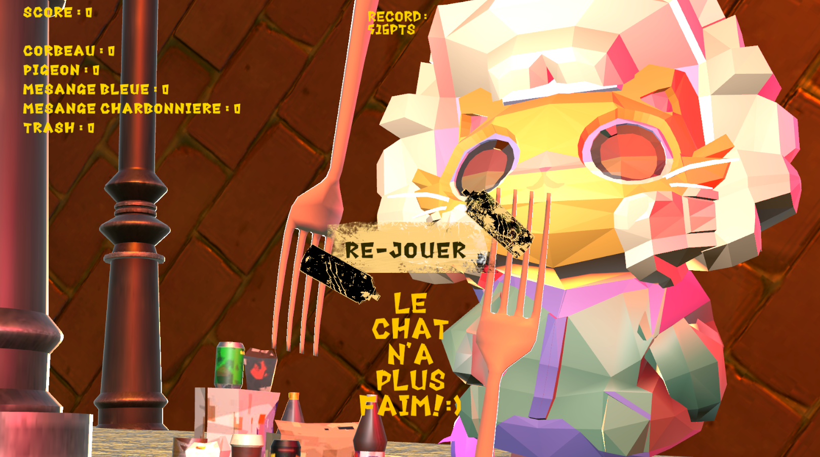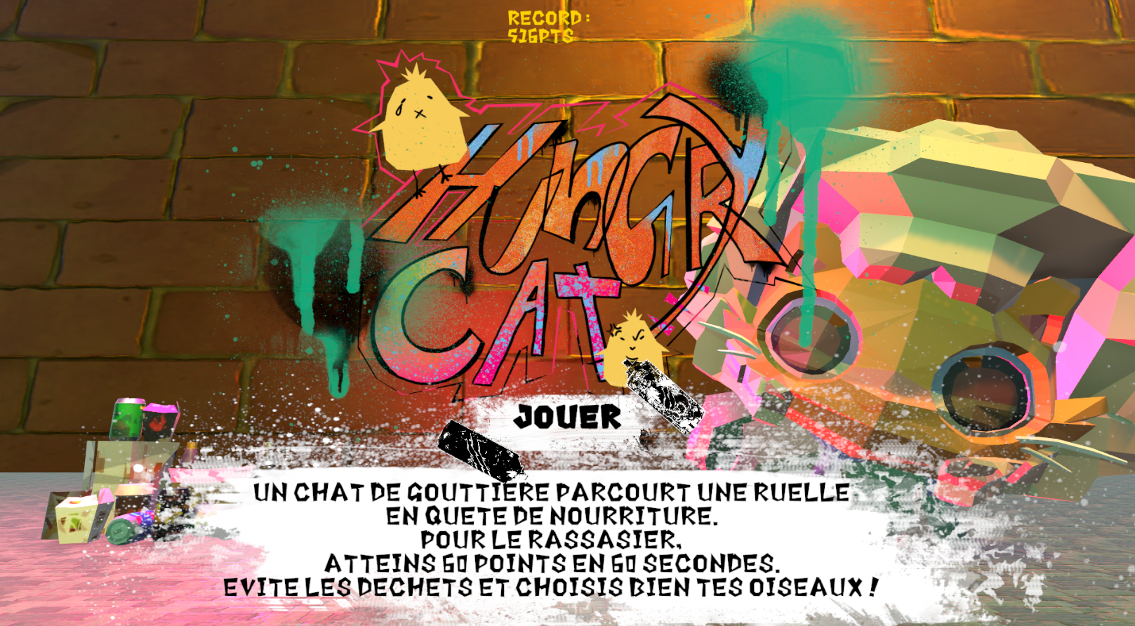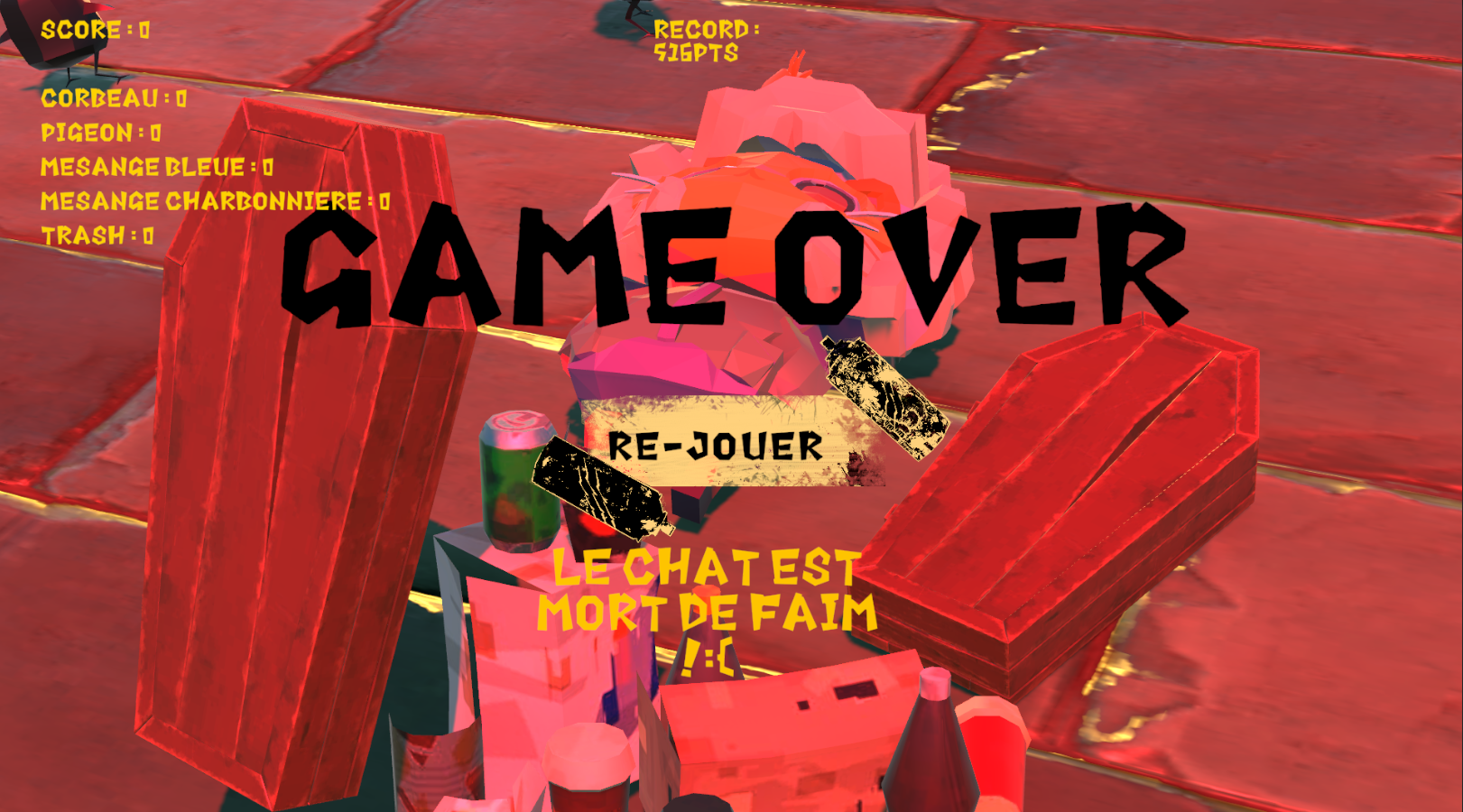 Réalisation d’un petit jeu Unity en cours de développement où un chat doit attraper des oiseaux pour survivre. Les assets 3D viennent principalement de Sketchfab et ont été retravaillés sur Blender.Le logo a été créé sur Photoshop.